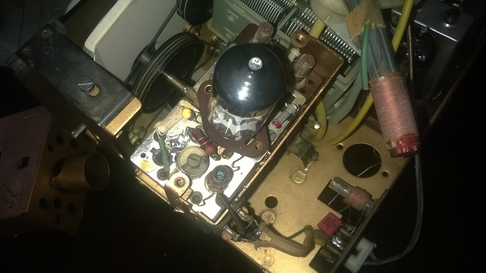 Als erstes wurde das Gerät zerlegt und das Chassis sowie das Gehäuse gründlich gereinigt. Das Radio muß wohl viele Jahre in der Küche gestanden haben. Darin roch es wie in einer 45 Jahre alten Frittenbude. Das Chassis hat fast alle Kondensatoren neu bekommen. Weiterhin war die Anodenspannung zu niedrig und es mußte noch ein Widerstand gewechselt werden. Jetzt stimmen alle im Schaltplan angegebenen Spannung wieder mit den Sollwerten überein. Das Gehäuse und alle Kunststoffteile wurden gewaschen und gereinigt. Das Gehäuse wurde geschliffen und lackiert. Dann zusammengebaut und siehe da, fertig. Ein neues Anschlusskabel dran und los ging es. In das Kabel habe ich noch einen zweipoligen Schnurschalter gebaut, damit die man zum Einschalten nicht die Schalter am Radio betätigen muß. Erstens sind die ausgenuddelt und zweitens kommen meine Frau und die Kinder da nicht dran. Es steht auf dem Küchenschrank.