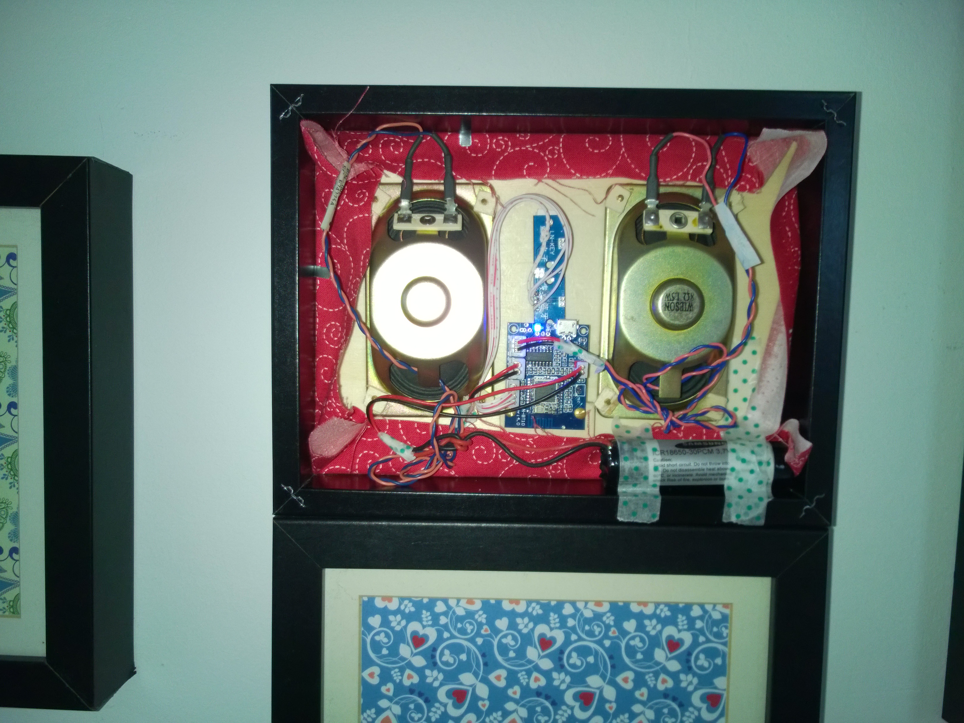 Wenn man einige Bauteile rumliegen hat und etwas Langeweile kommen manchmal ulkige Sachen heraus. Aus einer übriggebliebenen Bluetooth-Platine einem Li-Io Akku und zwei alten PC-Lautsprechern ist auf diesem Wege ein Bluetoothlautsprecher im Bilderrahemn entstanden. Der Klang ist zwar etwas dünn (verständlich!) aber irgendwie ist es ganz witzig.