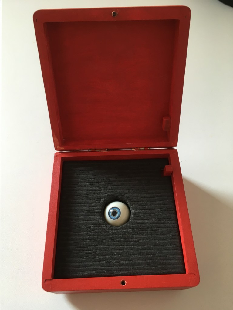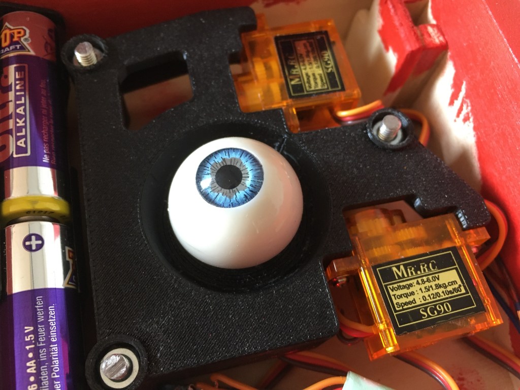 Ein Arduino Nano, ein Batteriehalter mit vier AA-Batterien und das Herzstück, die Machanik. An einem 3D gedruckten Grundkörper sind sowohl das bewegliche Auge als auch die beiden Miniaturservos befestigt, welche das Auge über zufällig ermittelte Werte bewegen. Die Zufallswerte für x und y sowie die Pausenzeiten werden mittels Zufallszahlen ermittelt.