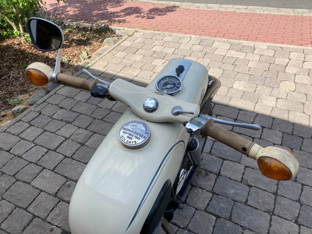 Im Prinzip ist sie in einem guten Zustand. Der Lack ist noch ok. Leider sind die goldenen Streifen abgewetzt und nur noch schemenhaft zu erkennen. Außerdem bin ich mir sicher, dass die Lampe mit dem runden Tacho oder der Motor nicht stimmt. 1968 wurde der Tacho von rund auf halbrund und auch der Motor umgestellt. In dieser MZ ist der zwar der neuere Motor aber immer noch der alte Tacho verbaut. Ich glaube der Tankdeckel kam auch erst später. Zusammen mit diesem Tankdeckel sollte sie noch den Trophy Schriftzug tragen, was sie aber nicht tut. Der Auspuff ist neu aus dem Zubehör. Den hatte mein Schwiegervater schon gewechselt.