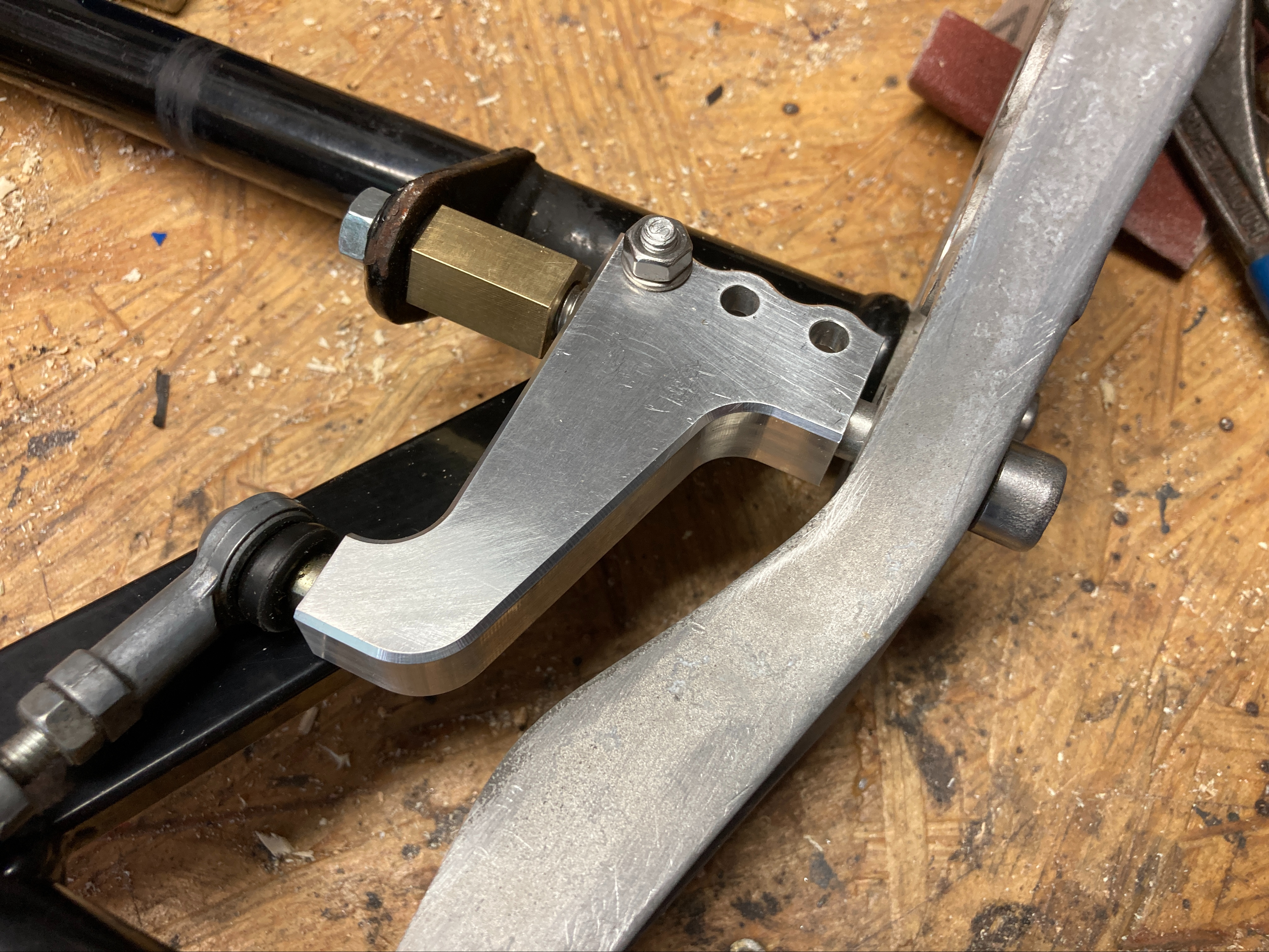 Die Vorderradaufhängung besteht aus einem Aluminiumprofil 20x20mm welches die Radachse, den Lenkhebel und das Halteblech für den Bremssattel trägt. Die Lenkachse wir durch je zwei 10 mm Stehlager realisiert. Die Vorderräder sind für einen Elektroroller gedacht und mussten leicht modifiziert werden, da sie ursprünglich eine durchgehende Achse hatten und beidseitig befestigt wurden. Hierfür habe ich die originale Achse entfernt und jeweils eine neue Distanzhülse, welche zwischen die beiden Radlager kommt, gedreht.