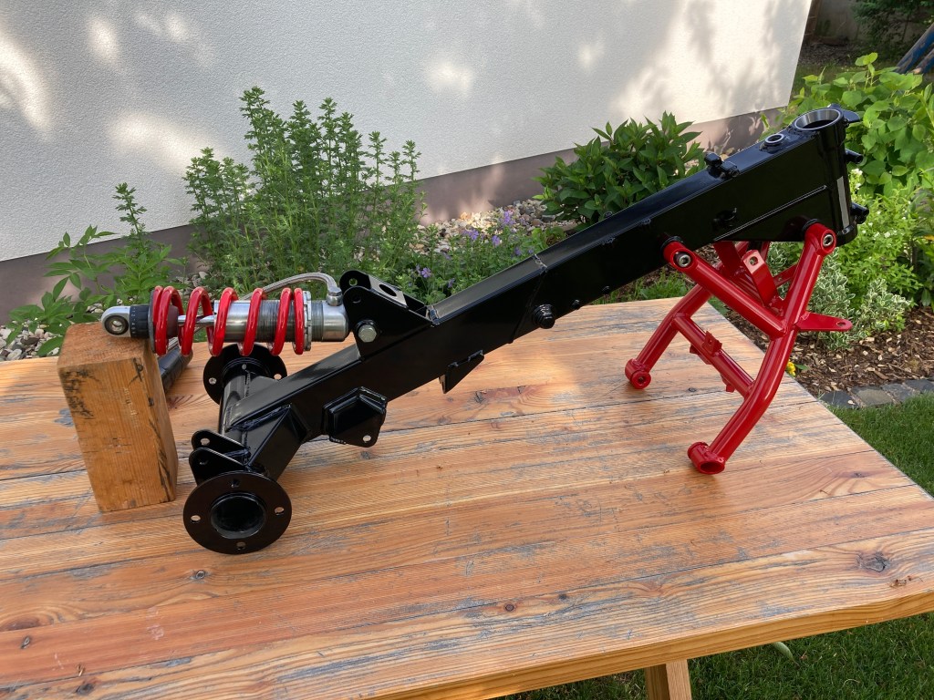 Die Befestigung der Räder habe ich prinzipiell übernommen und mir die Kontur zur Aufnahme der Achsen in je zwei Halbschalen fräsen lassen. Diese werden dann jeweils in das Kastenprofil der Hinterachse gesteckt und mit je vier Schrauben M8 verschraubt.