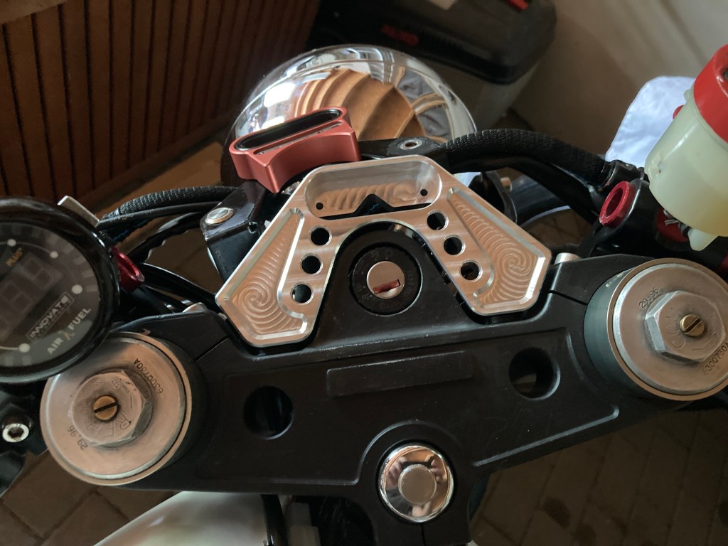 Die Drosselklappe der Centauro hat ein Potentiometer, welches den Winkel in ein Spannungssignal von 0-5V umwandelt. Im geschlossenen Zustand der Drosselklappe beträgt die Spannung laut Moto Guzzi Werksangabe 150 mV +/-2mV. Ein 10V Rechtecksignal der Motordrehzahl liegt vor. Das gibt die ECU der Weber Marelli 16M für den Drehzahlmesser aus. Dieses lässt sich einfach abgreifen. Die Lambdawerte werden mittels eines Innovate MTX-L Plus gemessen. Das MTX-L Plus hat eine analoge Schnittstelle und gibt abhängig vom Lambda bzw. AFR Werte ein 0-5V Signal aus. Beide Krümmer haben im Rahmen des Umbaus M18x1,5 Schweißmuffen bekommen um die Lambdasonde aufnehmen zu können. Das MTX-L Plus Messgerät habe ich notdürftig am Lenker befestigt.