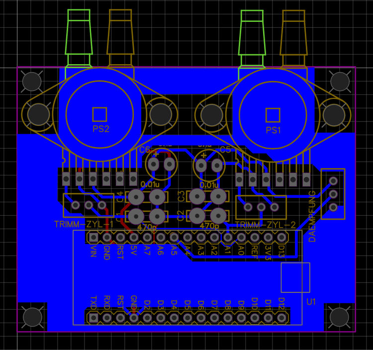 Die besagte Platine habe ich ursprünglich auf einer Lochrasterplatine aus Hartpapier aufgebaut. das ist nicht gut, da das Hartpapier Feuchtigkeit aufnimmt und sich stark wölbt. Jetzt habe ich die Reißleine gezogen und eine neue Platine entworfen und diese aus Epoxy fertigen lassen.