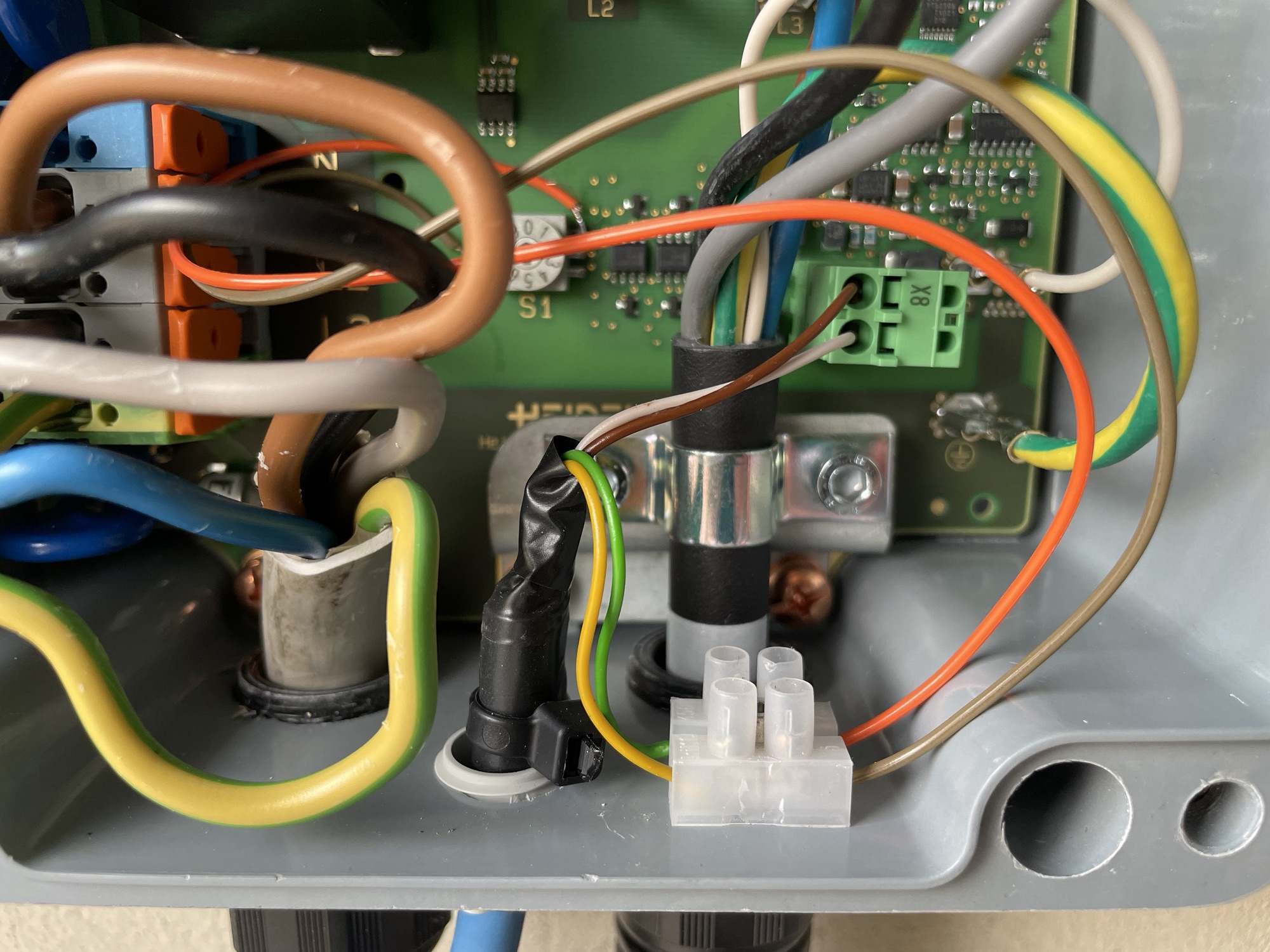 Letztendlich gehen vier Kabel in die Wallbox. Zwei an den Potentialfreien Kontakt um sie zu aktivieren bzw. zu deaktivieren und zwei um die maximale Ladeleistung einzustellen. Bei mir sieht das dann so aus.