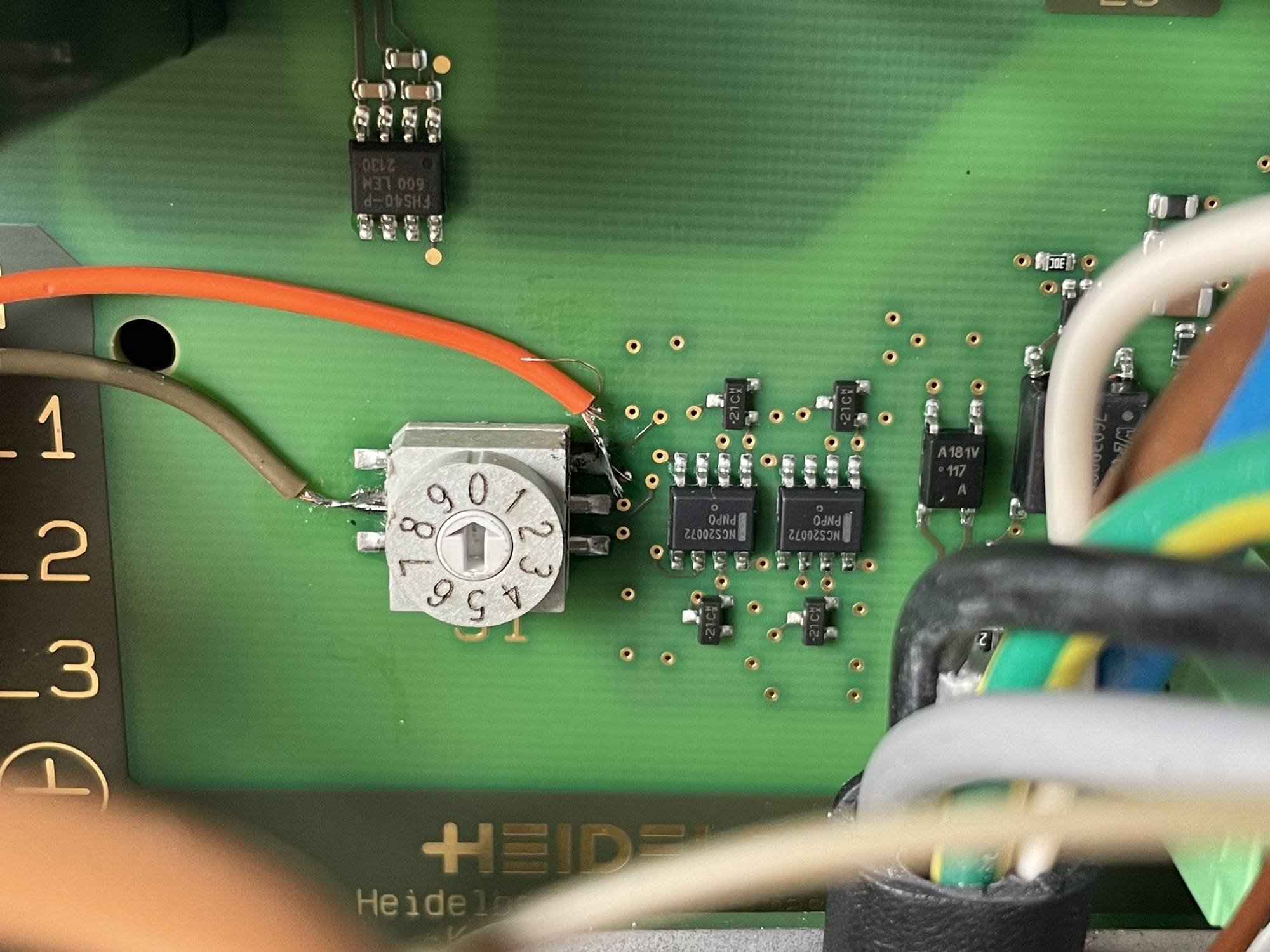 Im unteren Bereich über der Kabelklemme für das Ladekabel zum Auto befindet sich der potentialfreie Kintakt zur Freigabe der Wallbox. Im Originalzustand ist hier eine Brücke gesteckt und die Wallbox funktioniert immer. Links daneben auf der Leiterplatte befindet sich der 4bit Drehschalter zur Einstellung der Ladeleistung. Die Brücke kommt raus und der potentialfreie Kontakt wird zur Steuerung genutzt. Der Drehschalter bedarf noch etwas Bearbeitung.