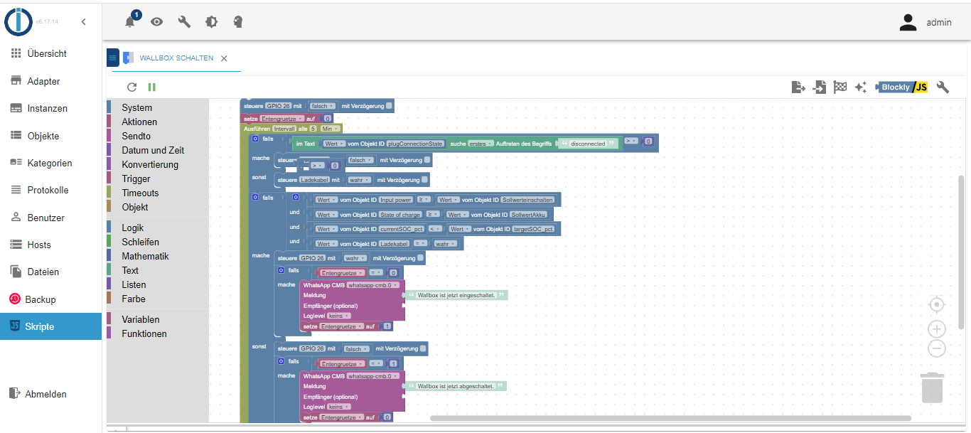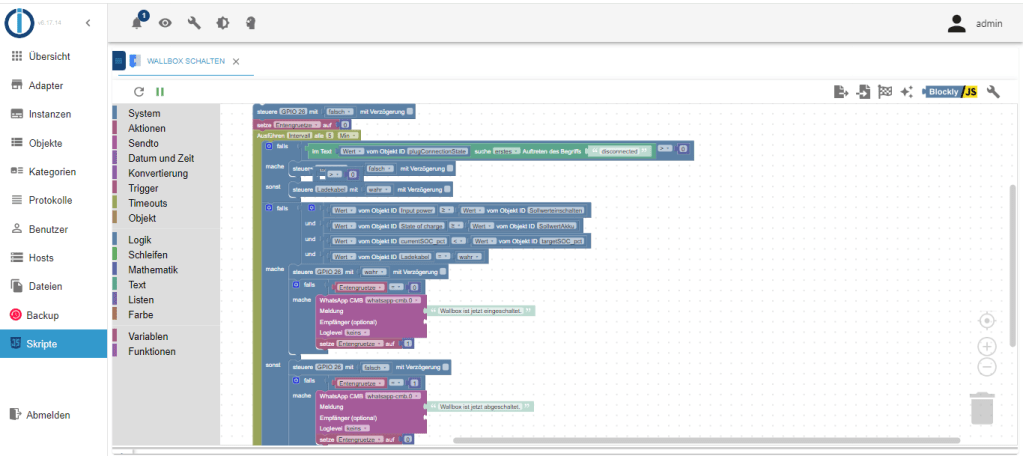 Um die nötige Steuerung zu programmieren, bietet iOBroker verschiedene grafische Programmiertools an. Ich habe mich für Blockly entschieden. Mein Code für die Wallboxsteuerung sieht so aus.