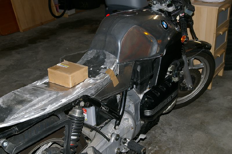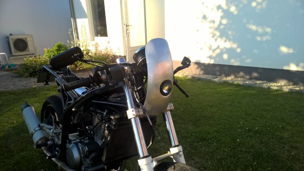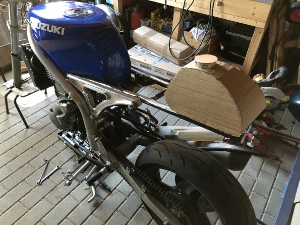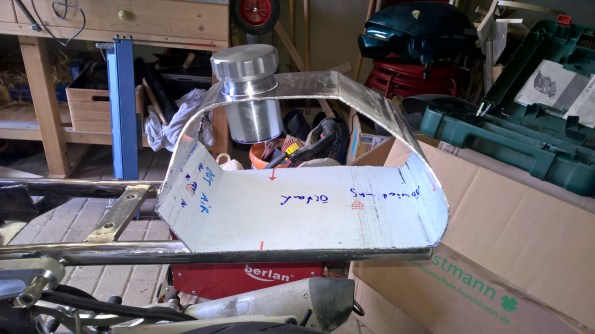 Mit dem Motorrad ist es ähnlich. Nach nunmehr dem vierten Entwurf habe ich mich für eine Ellipsoidscheinwerfer mit Eigenbauverkleidung aus einem Aluminiumschutzblech entschieden. Den Entwurf habe ich schon mal aus Wellpappe und Heißkleber gebaut.