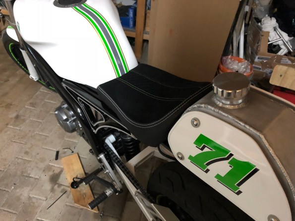 Das Motorrad ist weitestgehend wieder zusammengebaut. Der Öltank ist fertig und hat zwei Blenden mit Startnummer bekommen. Die hintere Felge ist auch schon beklebt. Das Nummernschild und die Beleuchtung sind montiert.